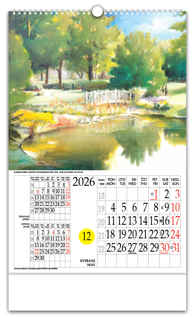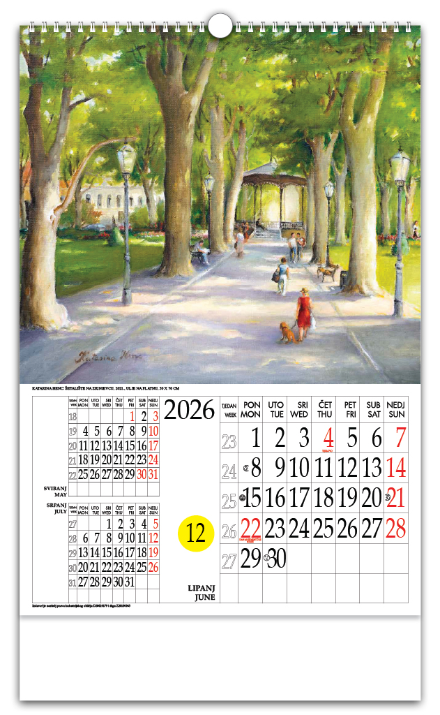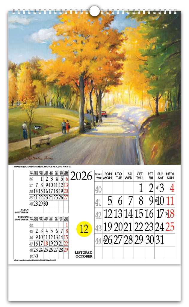 Uđite u 2026. godinu s daškom umjetnosti i topline, uranjajući u koloritne zagrebačke motive akademske slikarice Katarine Henc. Iako rođena u srcu Podravine, ova majstorica naivne umjetnosti pronalazi neiscrpnu inspiraciju u ulicama i parkovima glavnog grada. Njezin prepoznatljiv, samosvojan izraz, obogaćen toplim koloritom i suptilnim kontrastima svjetla i sjene, pretvara svaki mjesec u intimistički i melankoličan prizor koji će oplemeniti vaš prostor.