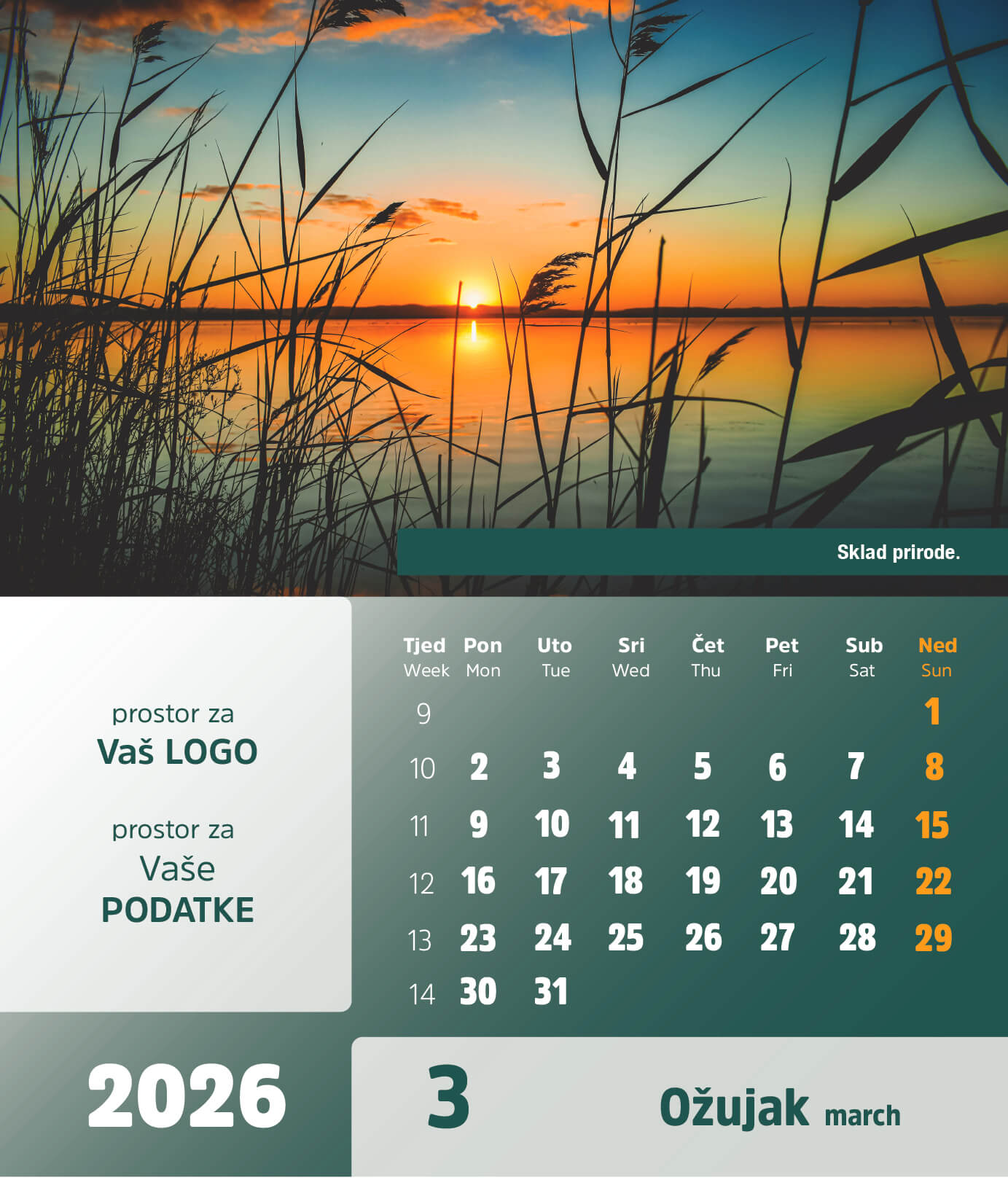 Model “Natura” donosi prirodan, smiren i profesionalan vizual – idealan za tvrtke koje žele ostaviti dojam pouzdanosti i ekološke osviještenosti. Format je dovoljno kompaktan za svakodnevnu upotrebu, a dovoljno zanimljiv da bude vidljiv na radnom mjestu. Vaš logotip na svakom listu garantira dugotrajnu vidljivost – svaki mjesec podsjetnik na vas.